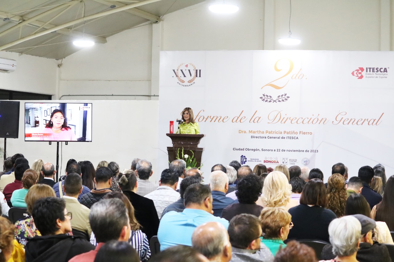 En el marco del XXVII Aniversario del Instituto Tecnológico Superior de Cajeme (ITESCA), la Dra. Martha Patricia Patiño Fierro, Directora General, presentó importantes logros y resultados, alcanzados en el periodo 2022-2023, al rendir su segundo Informe de Actividades en sus funciones sustantivas como Docencia, Investigación, Vinculación, Planeación y Administración.