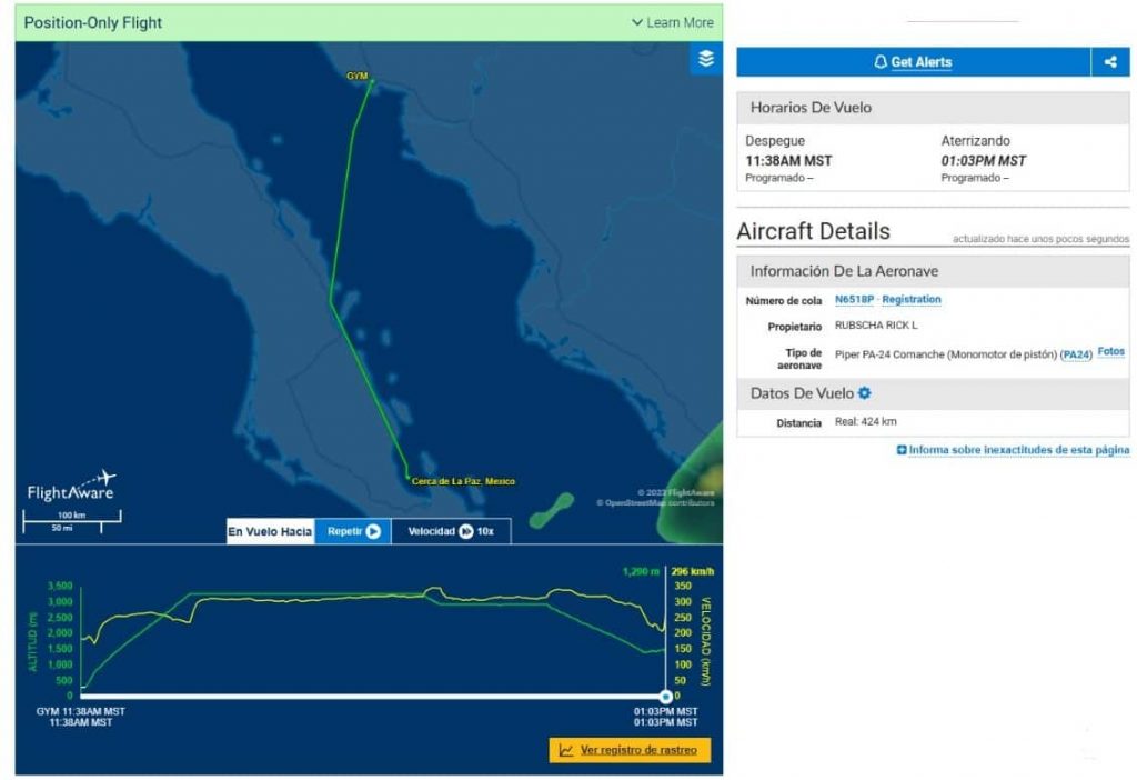 Según información del vuelo, despegó de Guaymas a las 11:38 horas del lunes y aterrizaría alrededor de las 13:03 horas, y con número de identificación en la cola: N6518P.
