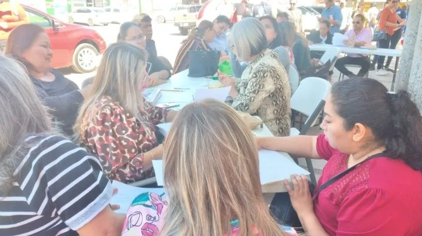 En mesas, bancas y sillas que los docentes tuvieron que llevar, se instalaron por fuera de la entrada principal sobre la calle Tabasco para realizar su reunión.