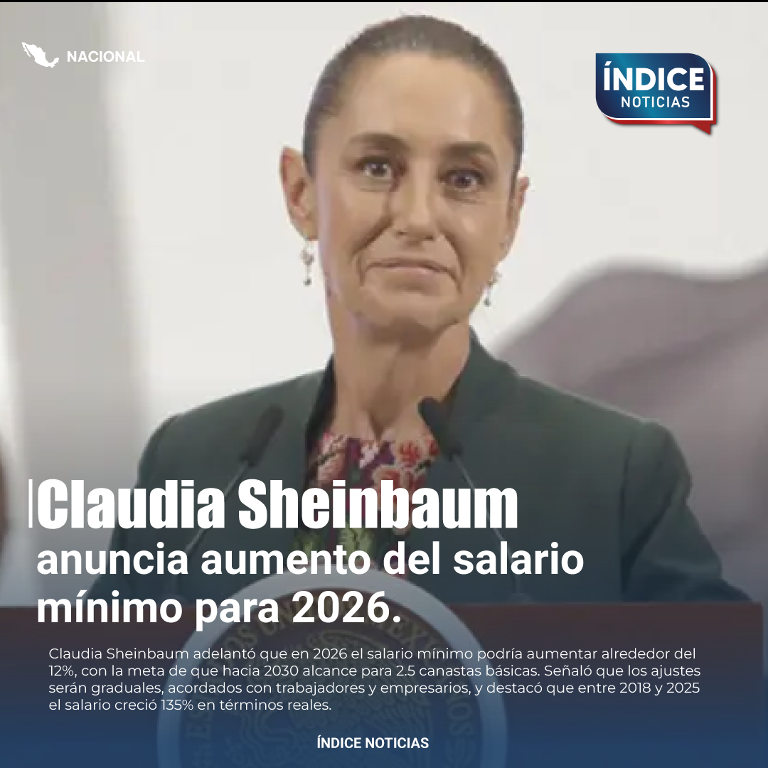 La presidenta Claudia Sheinbaum adelantó que el incremento al salario mínimo para 2026 podría situarse alrededor del 12 por ciento, similar al aplicado este año, con el objetivo de fortalecer el poder adquisitivo de los trabajadores.