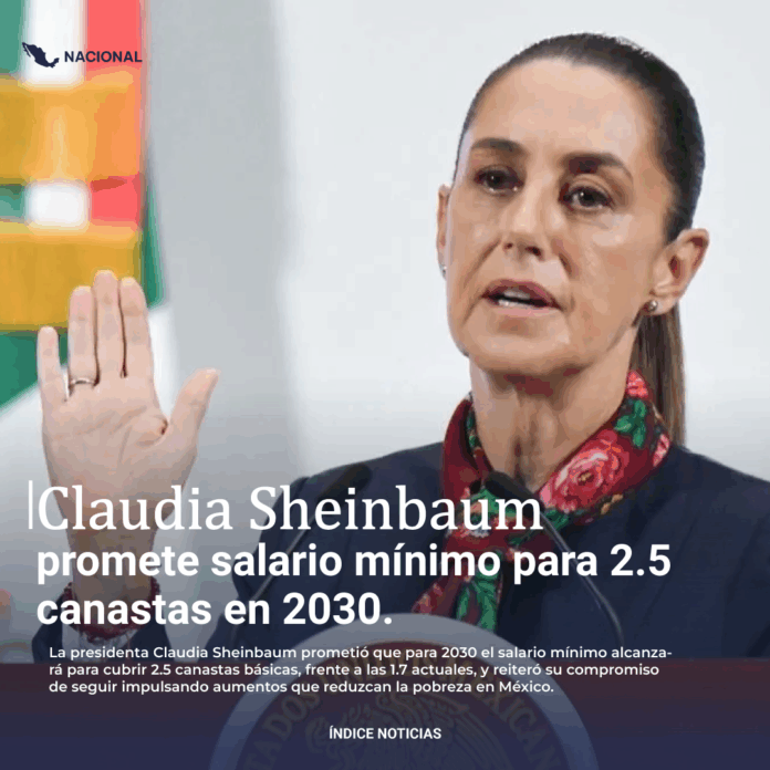 Cuando concluya el sexenio, en 2030, el salario mínimo alcanzará para cubrir 2.5 canastas básicas’, prometió la presidenta Claudia Sheinbaum Pardo, ‘el cual actualmente alcanza para 1.7 canastas’.