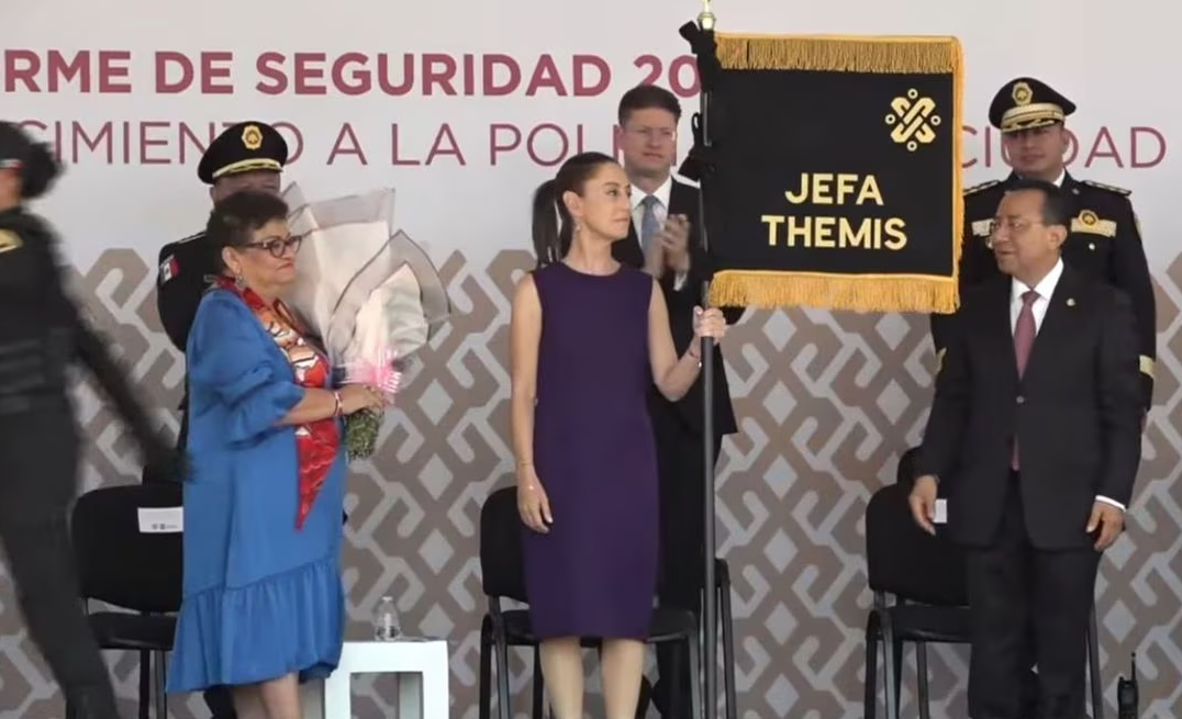 Incluso, una niña y una elemento de Athenas, le entregaron un gran ramo de flores y la otra con estandarte con la leyenda «Jefa Themis», indicativo en seguridad de Sheinbaum. Mientras tanto, la mandataria agradeció los presentes y las abrazo.