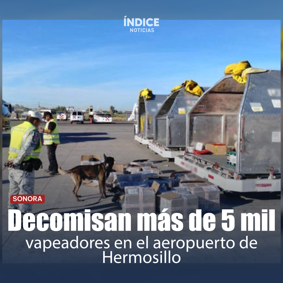 Elementos de la Guardia Nacional aseguraron un lote de 5 mil 130 vapeadores con nicotina durante una inspección realizada en una empresa de paquetería ubicada dentro del Aeropuerto Internacional de Hermosillo.