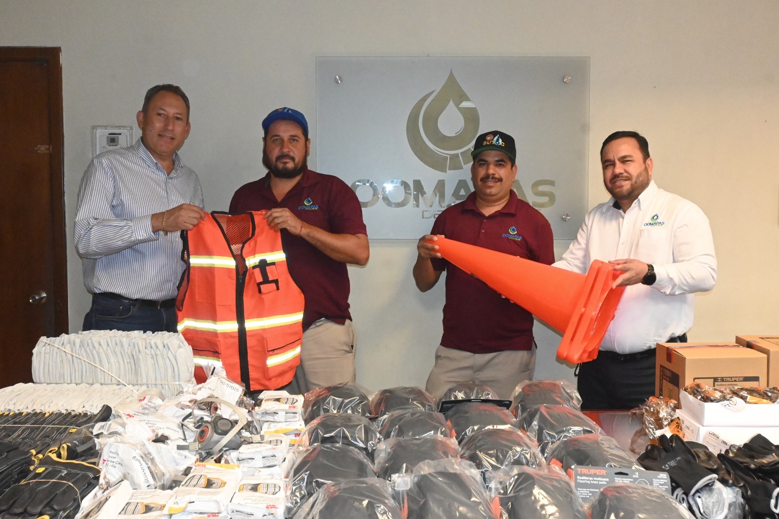 Con el objetivo de cumplir con el compromiso establecido por el presidente municipal Javier Lamarque, de brindar las mejores condiciones de trabajo al personal del organismo operador municipal de agua, alcantarillado y saneamiento de Cajeme; el director administrativo, Omar Acosta, acompañado del contralor Roberto Valenzuela, entregaron a nombre del director general Luis Alberto Ruiz, equipo de seguridad y protección a los trabajadores de la áreas de equipos de desazolve, cortes y lectura.