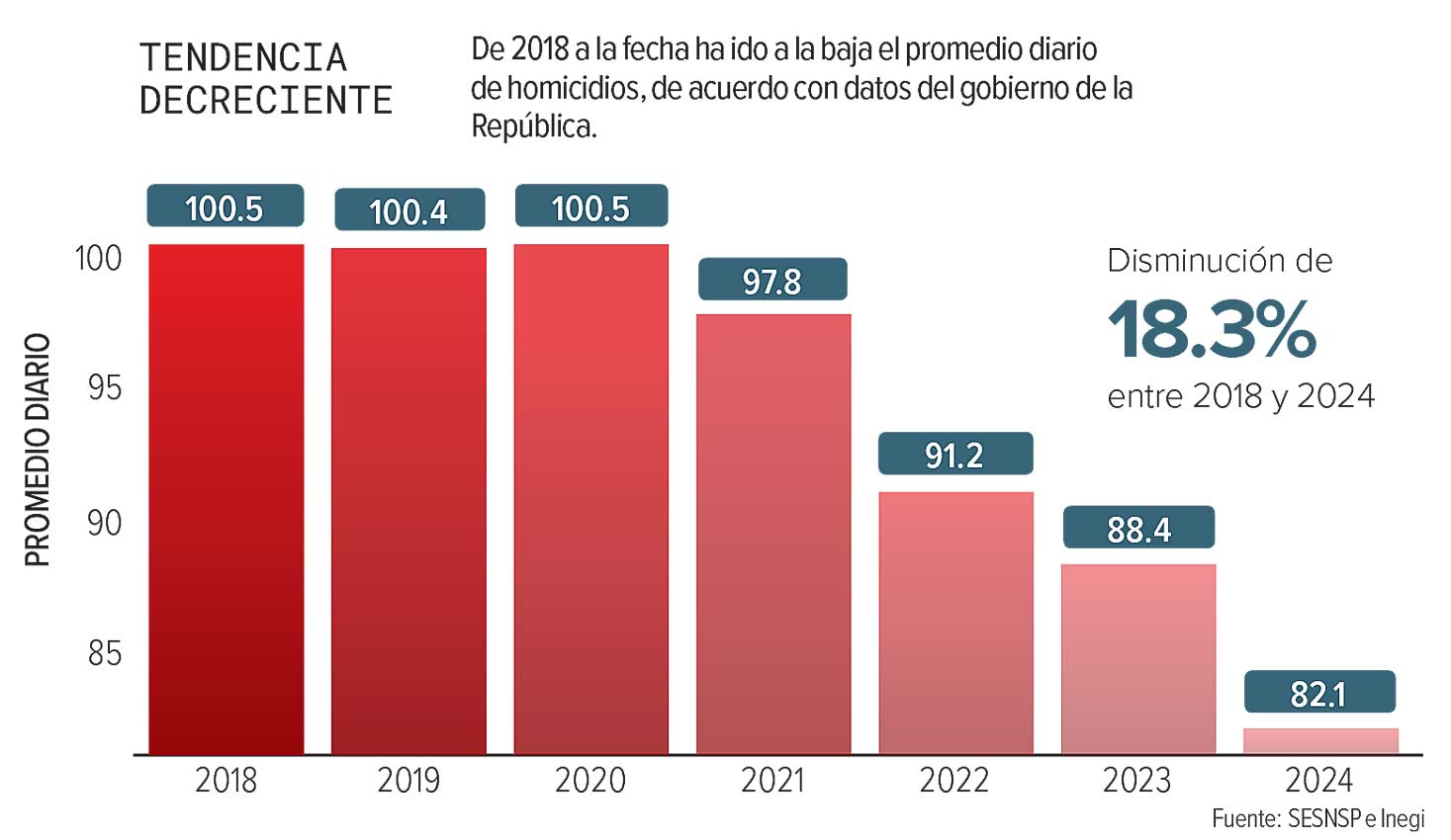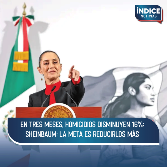 La presidenta de la República, Claudia Sheinbaum, informó que en los primeros 100 días de su administración el promedio diario de víctimas de homicidio doloso disminuyó en 16.3 % entre septiembre y diciembre de 2024.