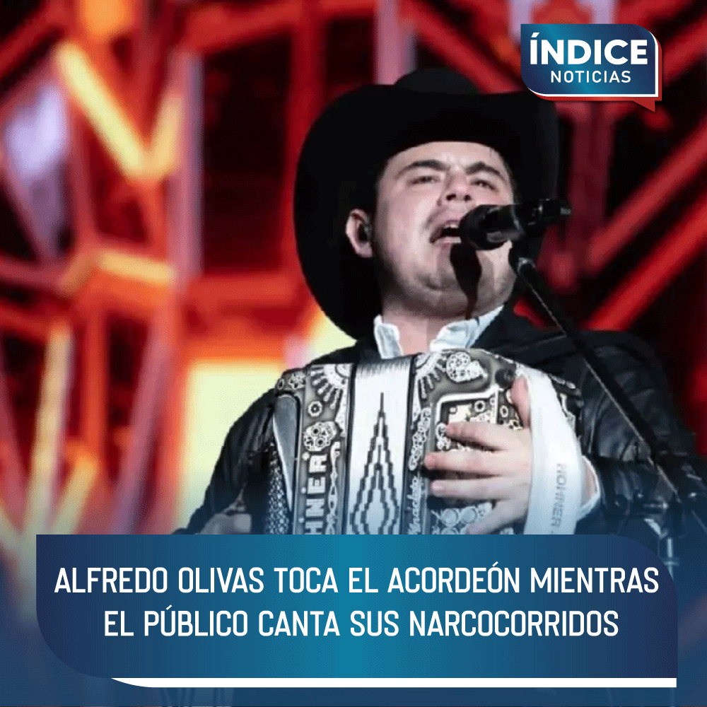 A diferencia de otros exponentes del regional mexicano como Grupo Firme o El Recodo, quienes han optado por eliminar los corridos de sus conciertos, Alfredo Olivas recurrió a una táctica poco convencional: interpretó con su acordeón los instrumentales de canciones como “El malo de Culiacán”, “Corrido del infiernito” y “El paciente”, pero dejó que fuera el público quien cantara las letras.