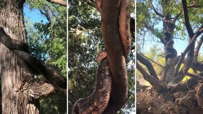 En las fotografías se puede apreciar tres ejemplares de al menos cuatro metros de longitud, y algunos 40 centímetros de diámetro envueltos en troncos de árboles.