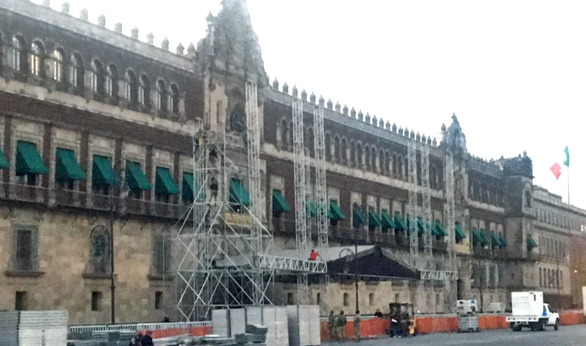 Abajo del Balcón Presidencial de Palacio Nacional se han comenzado a instalar las estructuras metálicas del escenario y torres que soportarán bocinas que servirán para el mensaje que ofrecerá el jefe del Ejecutivo federal este sábado en punto de las 17:00 horas.