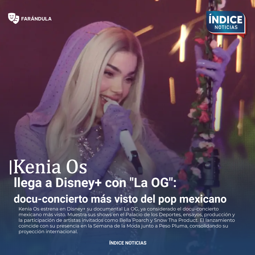 Tras arrasar en taquilla, Kenia Os llega a Disney+ con su documental Kenia Os: La OG, que ya se posiciona como el docu-concierto mexicano más visto de la historia. Dirigido por Ana Nube y Gastón Etchechoury, el filme retrata los dos conciertos que la cantante ofreció en el Palacio de los Deportes en noviembre pasado.