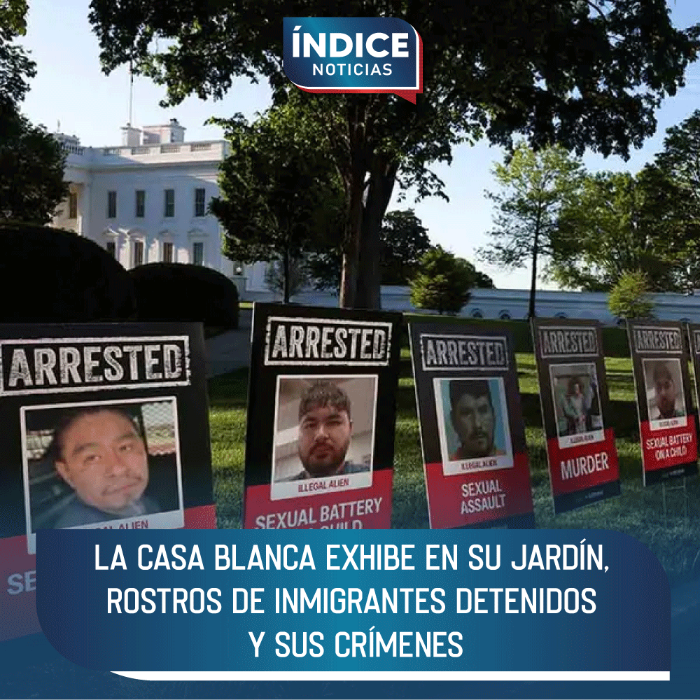 El césped de la Casa Blanca fue decorado con carteles al estilo de fotografías policiales que mostraban los rostros de 100 inmigrantes en situación irregular, presuntamente arrestados, junto con una lista de los delitos graves que algunos de ellos habrían cometido.