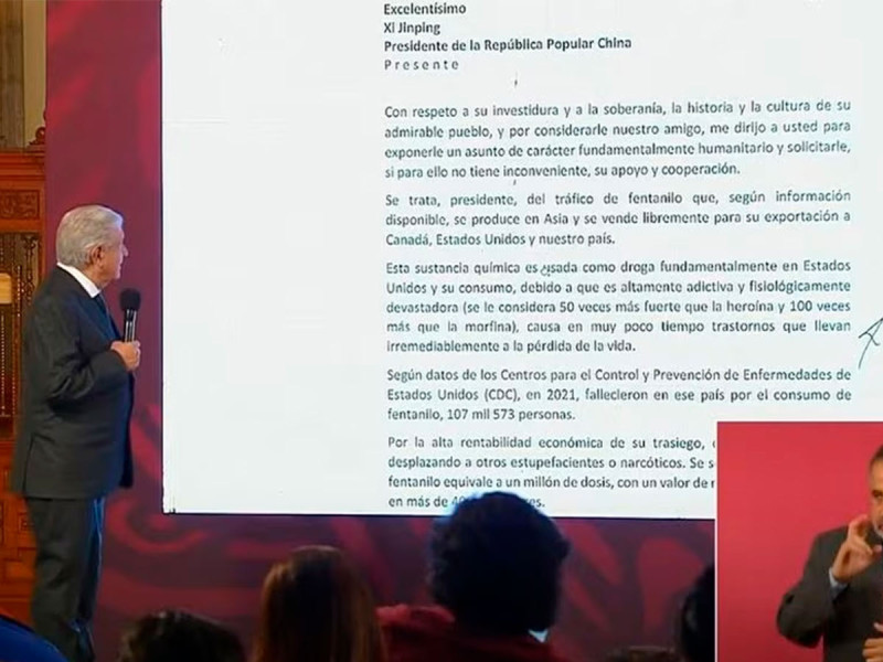 Solicito que, por razones humanitarias, ayuden a controlar los envíos de fentanilo que puedan remitirse de China, y asimismo le pido nos pueda proporcionar información de quiénes importan la sustancia, en qué cantidades y qué embarcaciones”, le dijo en su carta al presidente chino.