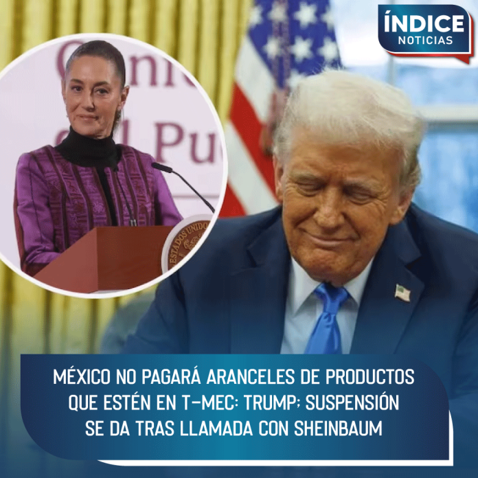 El presidente Donald Trump anunció que México no tendrá que pagar aranceles para comercio en el marco del T-MEC, tras una llamada telefónica que sostuvo con la presidenta Claudia Sheinbaum.