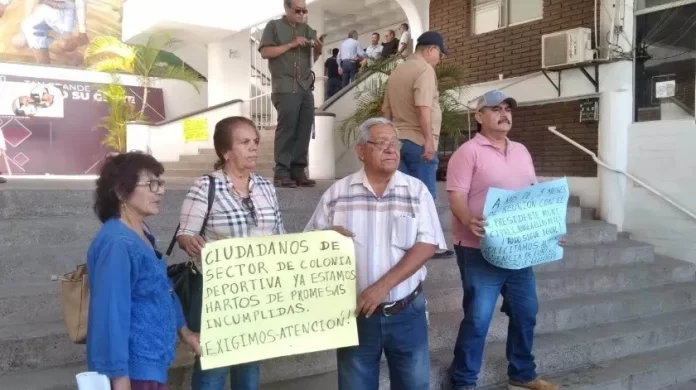 NAVOJOA, Sonora.- Representantes de Comités de Vecinos de la colonia Deportiva, respaldados por 600 familias, se manifestaron ayer en el Palacio Municipal para pedir solución al problema de calles, drenaje pluvial y baja presión en el suministro de agua potable.