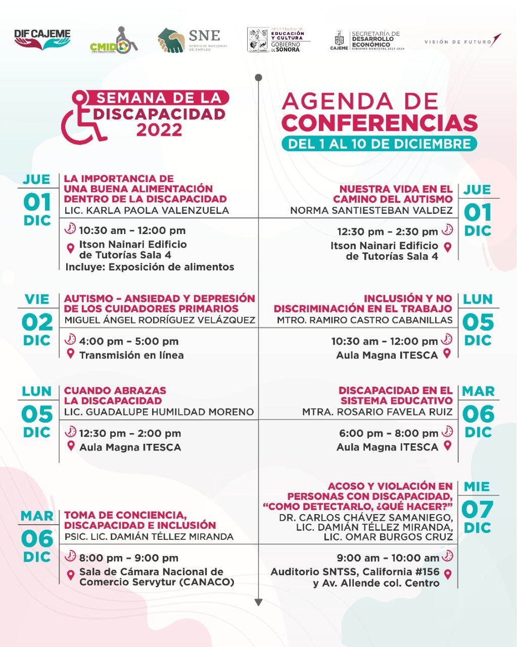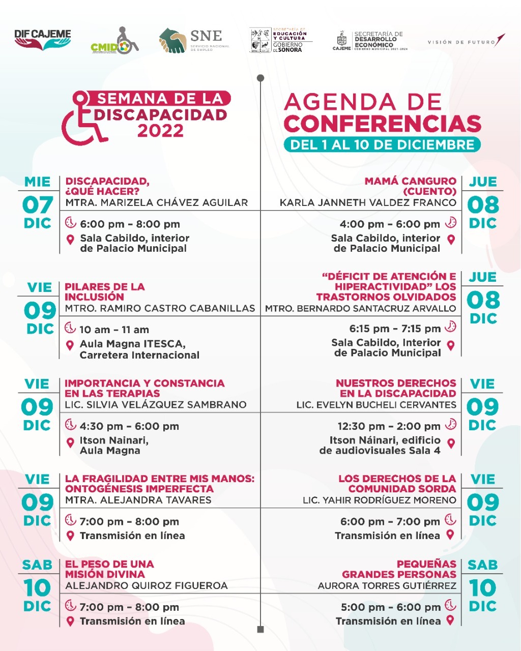 DIF Cajeme en conjunto con CMID presentan 10 días de pláticas y conferencias para informar en aspectos de discapacidad como toma de conciencia, la depresión y ansiedad que enfrentan los cuidadores primarios, la inclusión y no discriminación en el trabajo, tipos de trastornos como hiperactividad y déficit de atención, derechos en la discapacidad, entre muchos temas más.