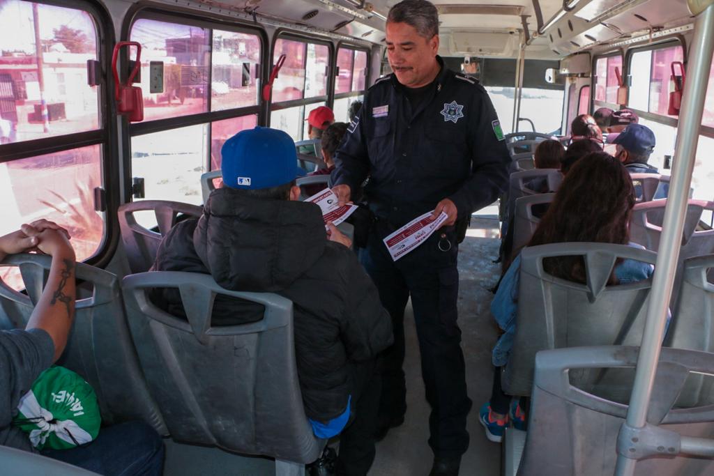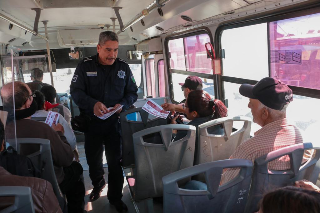 Con acciones continuas de proximidad social, agentes de la Secretaría de Seguridad Pública Municipal, realizaron un operativo en el transporte público con rutas al Poniente de la ciudad, generando confianza en las y los ciudadanos para fomentar la denuncia de delitos.