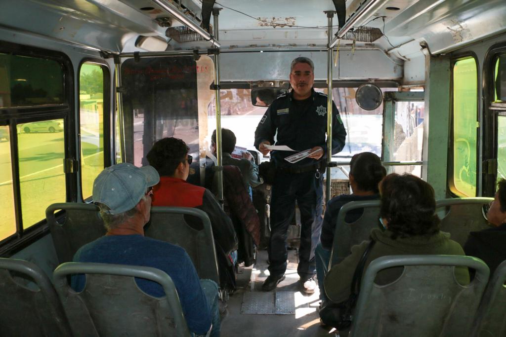 Con acciones continuas de proximidad social, agentes de la Secretaría de Seguridad Pública Municipal, realizaron un operativo en el transporte público con rutas al Poniente de la ciudad, generando confianza en las y los ciudadanos para fomentar la denuncia de delitos.