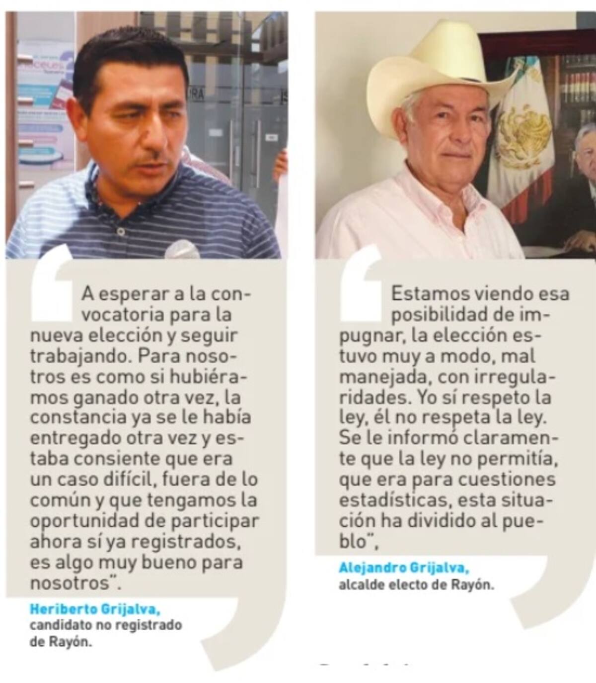 En la elección del ayuntamiento de Rayón, Heriberto Grijalva se promulgó como candidato no registrado y su nombre fue escrito 711 veces en las boletas, mientras que Alejandro Grijalva, candidato del PRI, PAN, PRD obtuvo 674 votos.