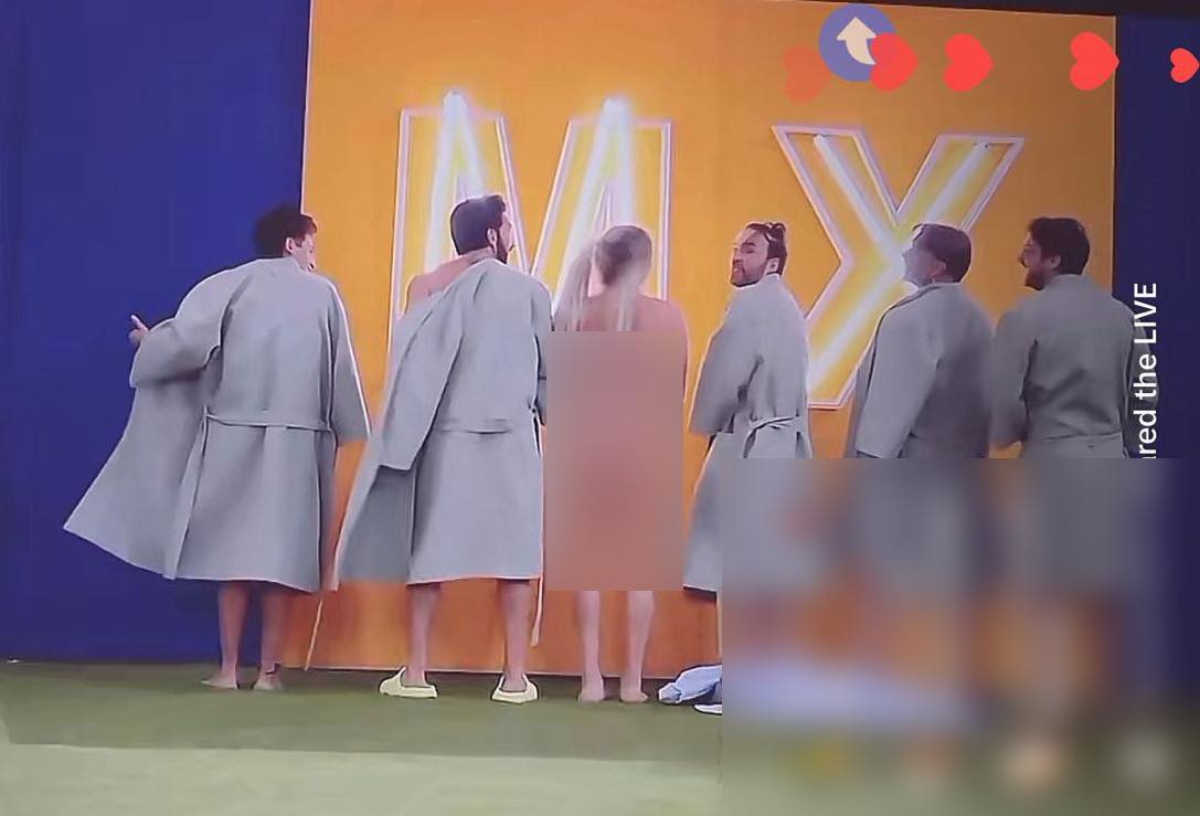 Apio, Emilio, Sergio, Nicola, Poncho y Wendy acudieron a la alberca solo cubiertos con una bata de baño y luego, se metieron a la alberca pero desnudos.
