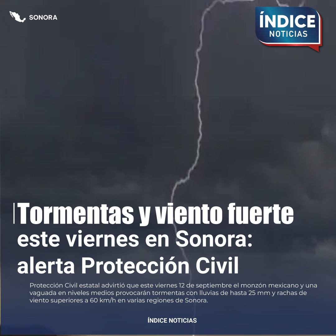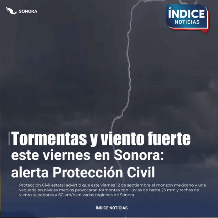 Protección Civil estatal advirtió que este viernes 12 de septiembre el monzón mexicano y una vaguada en niveles medios provocarán tormentas con lluvias de hasta 25 mm y rachas de viento superiores a 60 km/h en varias regiones de Sonora.