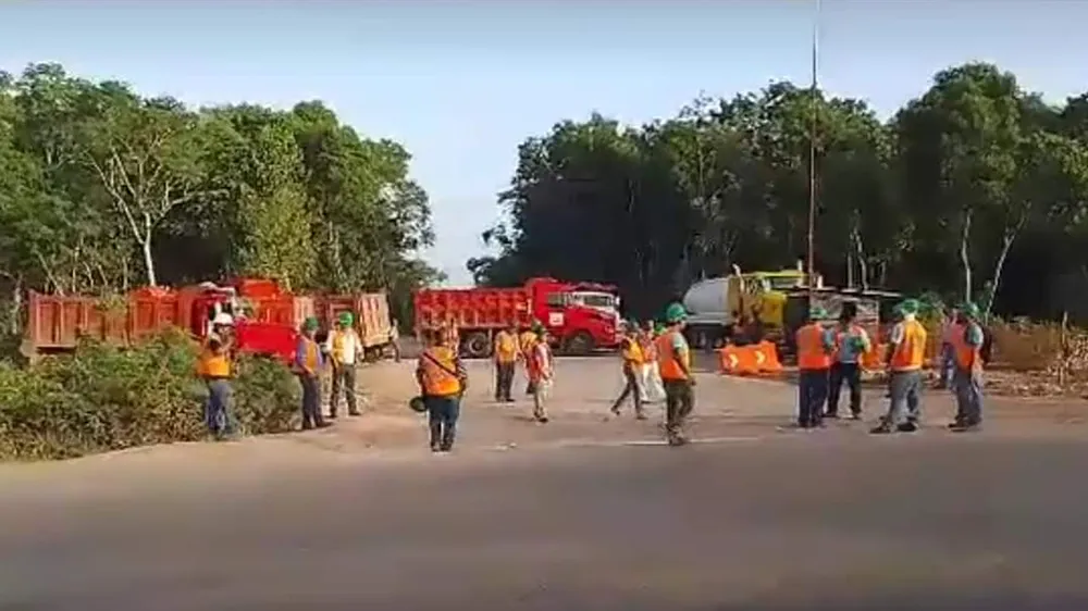 Trabajadores contratados por la Secretaría de la Defensa Nacional (Sedena) bloquearon los accesos a las obras del Tramo 6 del Tren Maya.