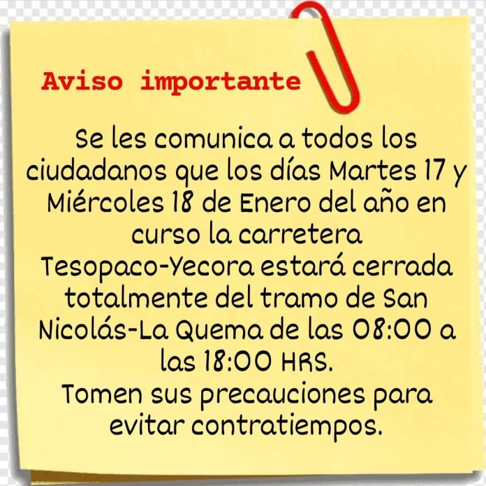 Tramo San Nicolas – La Quema estará cerrado el Miércoles 18 de Enero. 16,Ene, 2023 FacebookTwitterPinterestWhatsApp Yécora, Sonora. El municipio de Yécora avisa que este miércoles 18 de Enero, el tramo San Nicolas – La Quema estará cerrado en su totalidad por reparación desde las 08:00 hrs a las 18:00 hrs. Tomen sus precauciones